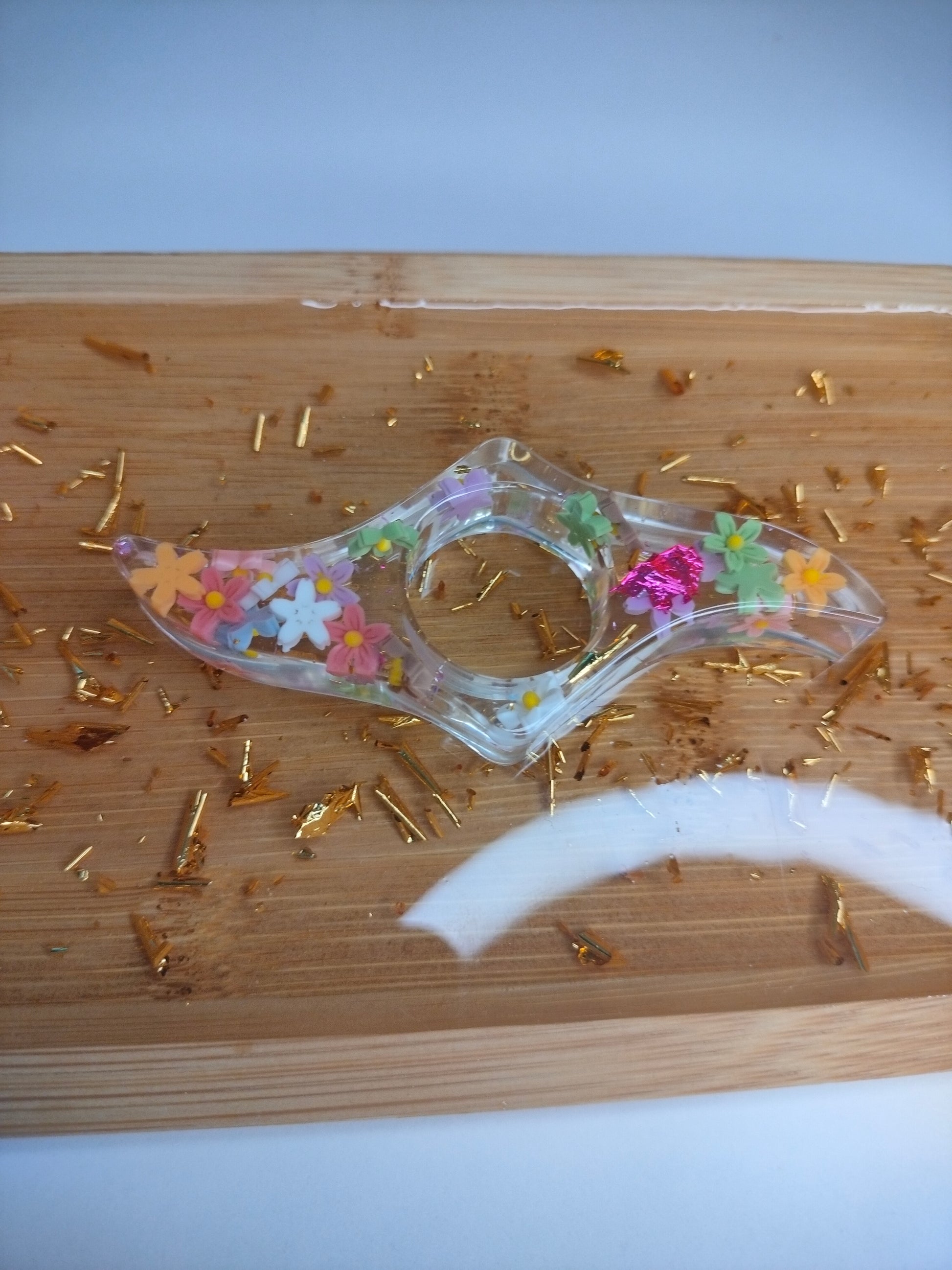 Bague de lecture fleurie transparente avec des feuilles d'or , roses et violines