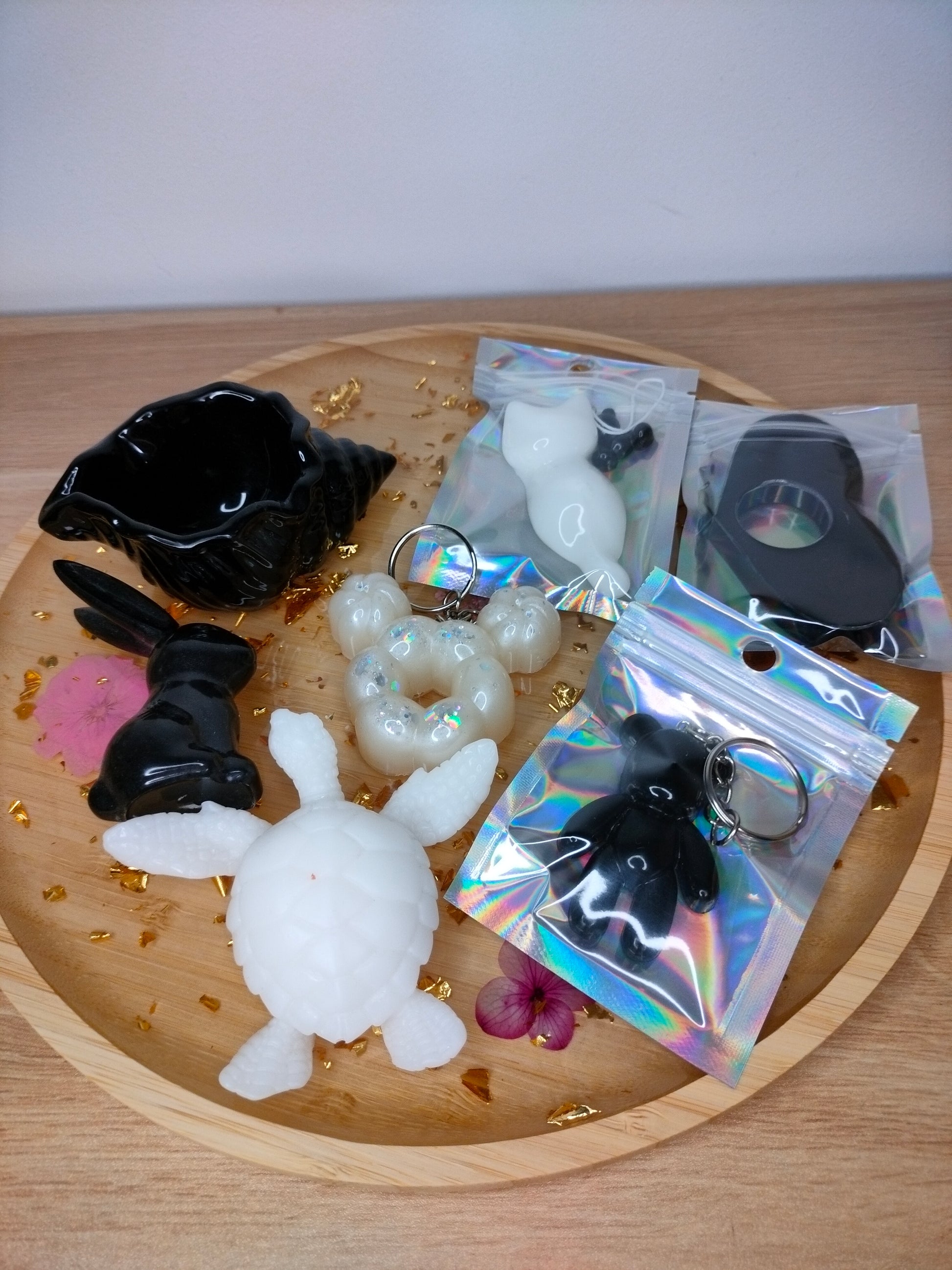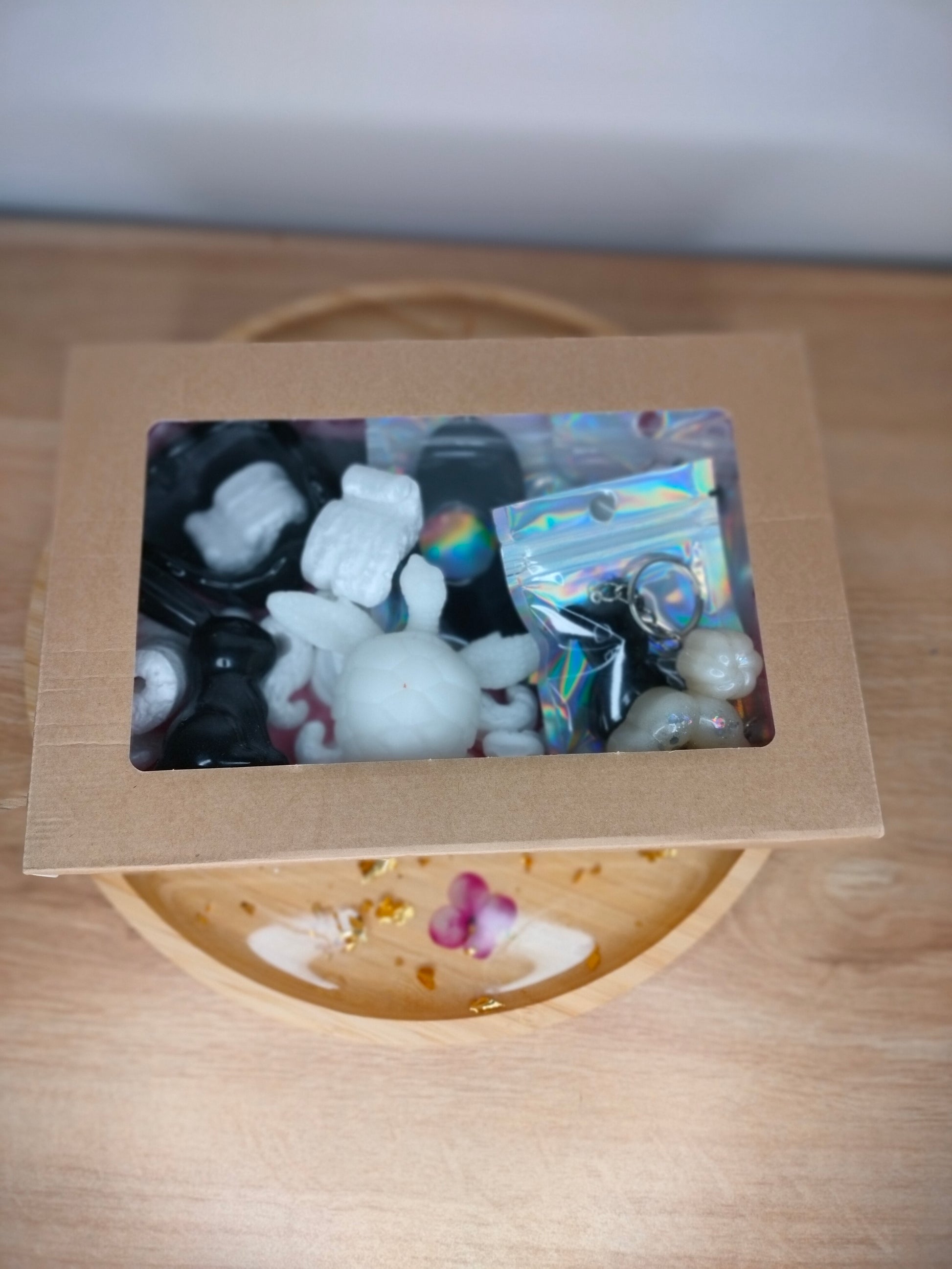 Box découverte noire et blanche composée de 7 articles dont 1 vide-poches coquillage, 1 figurine tortue , 1 figurine chat , 1 figurine lapin , 1 bague de lecture, 1 porte-clé nounours , 1 porte-clé donuts