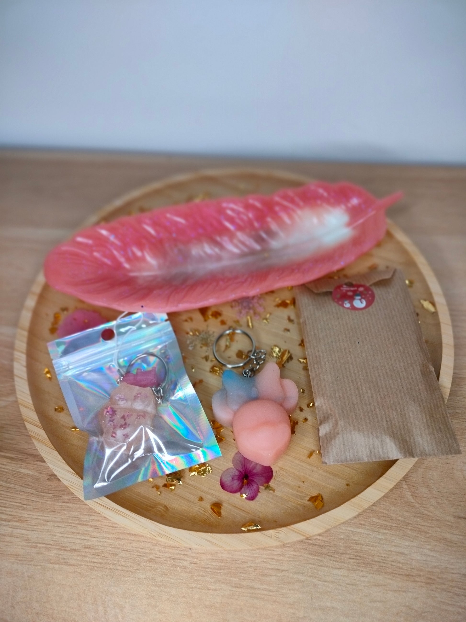 Box découverte rose composée de 4 créations dont 1 vide-poches plume , 1 porte-clé chouette , 1 pochettes surprise , 1 bijoux de téléphone ourson