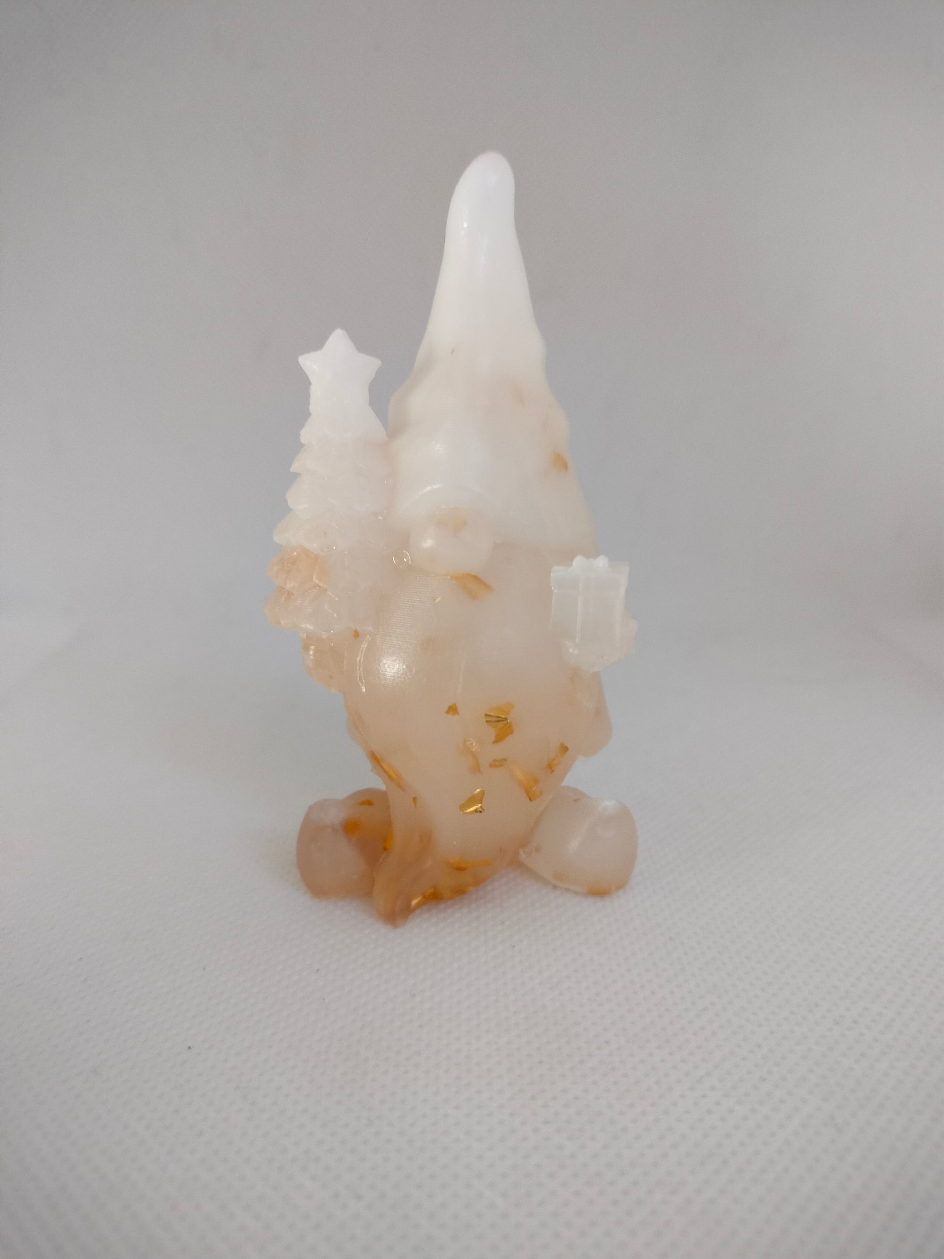 Figurine gnome accompagné d'un cadeau ainsi que d'un sapin blanc avec des feuilles d'or