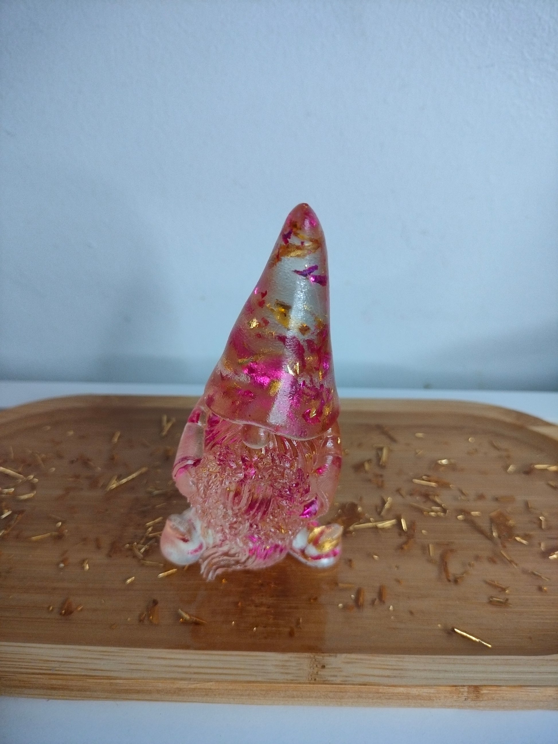 Figurine gnome tenant une couronne de noel transparent avec des feuilles d'or et roses