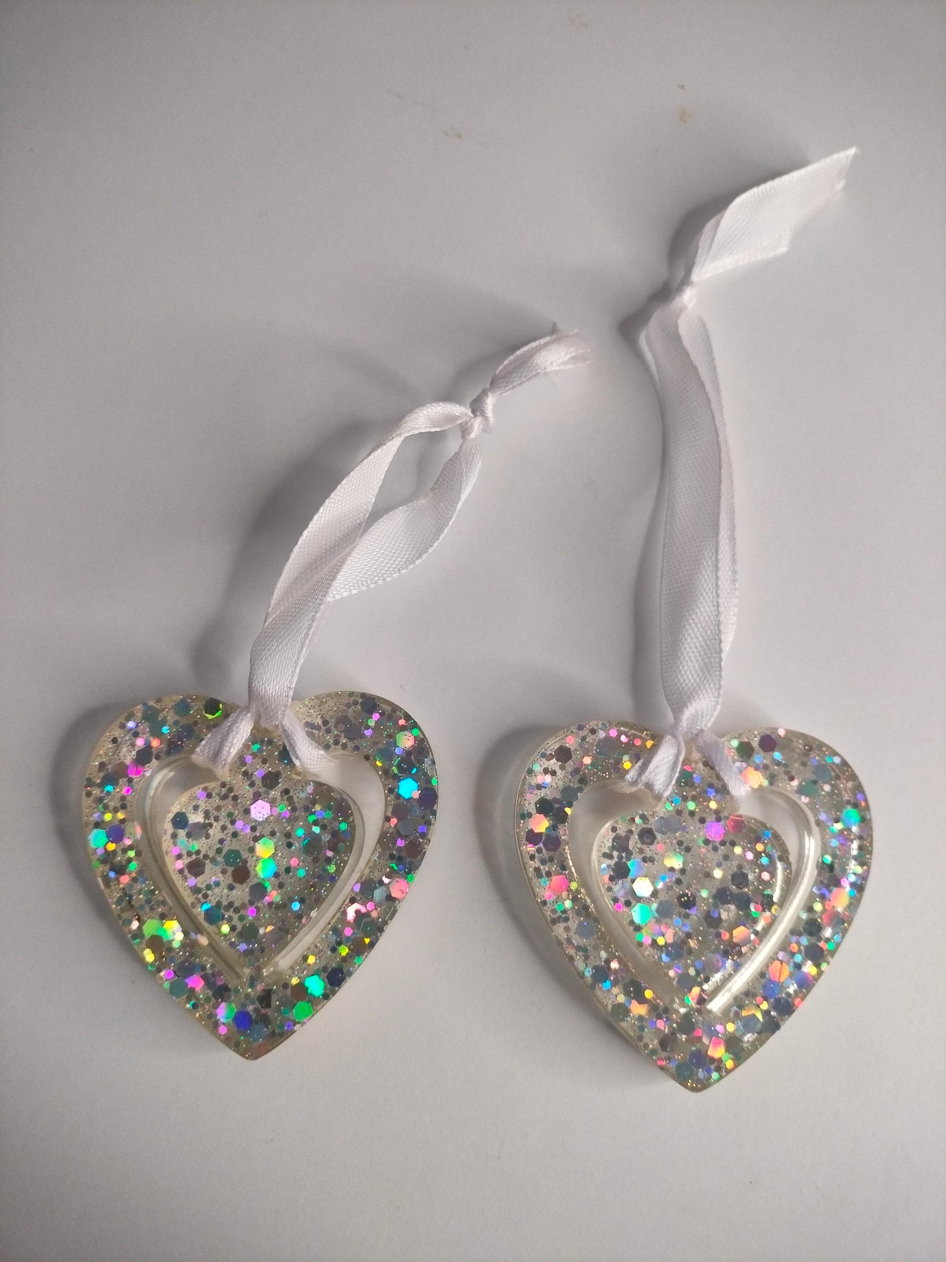 Lot de 2 suspensions de noël en forme de coeur avec des paillettes holographiques.