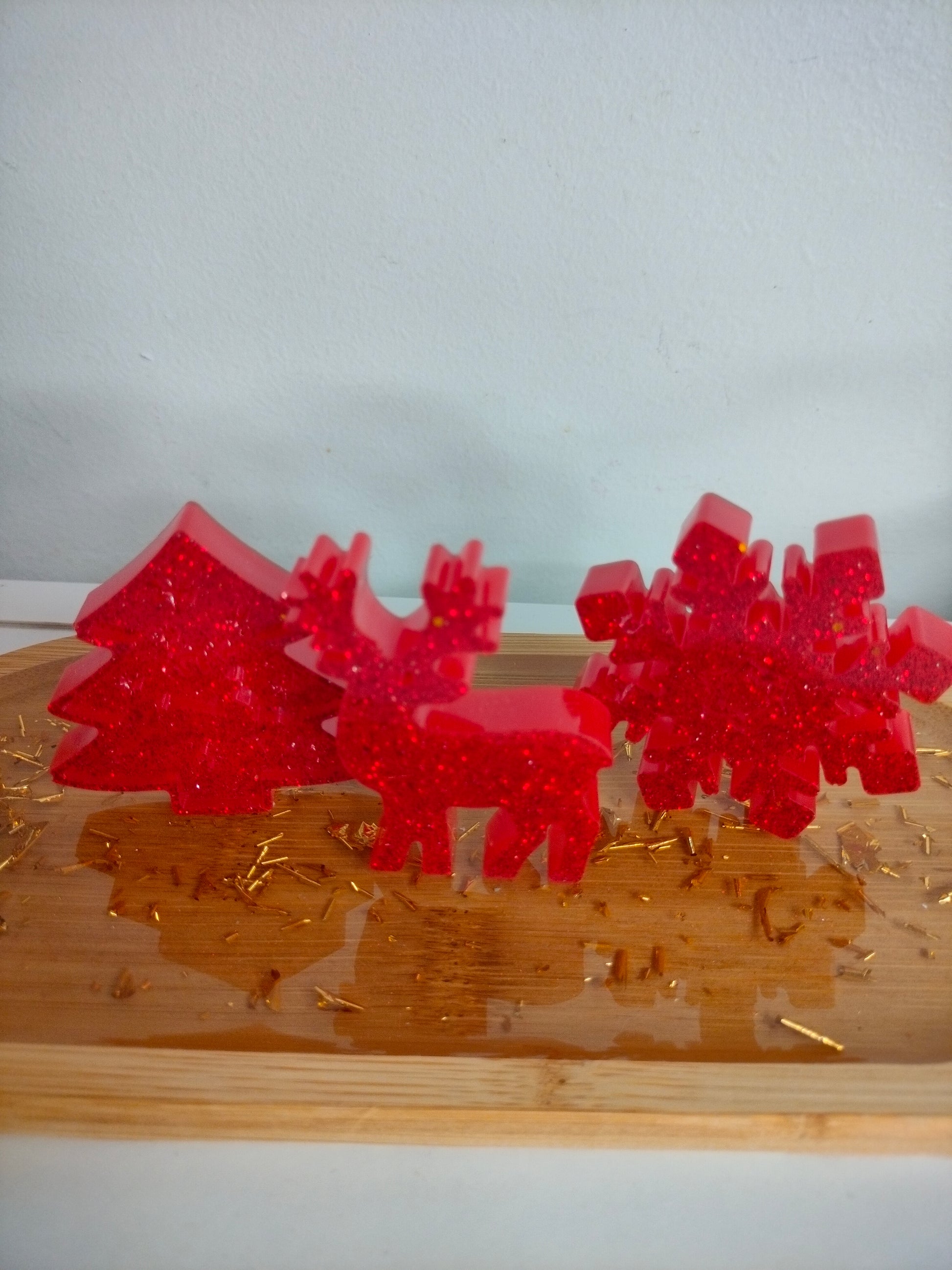 Lot de 3 décorations de table rouge pailleté comprenant : 1 flocon , 1 sapin et 1 renne.