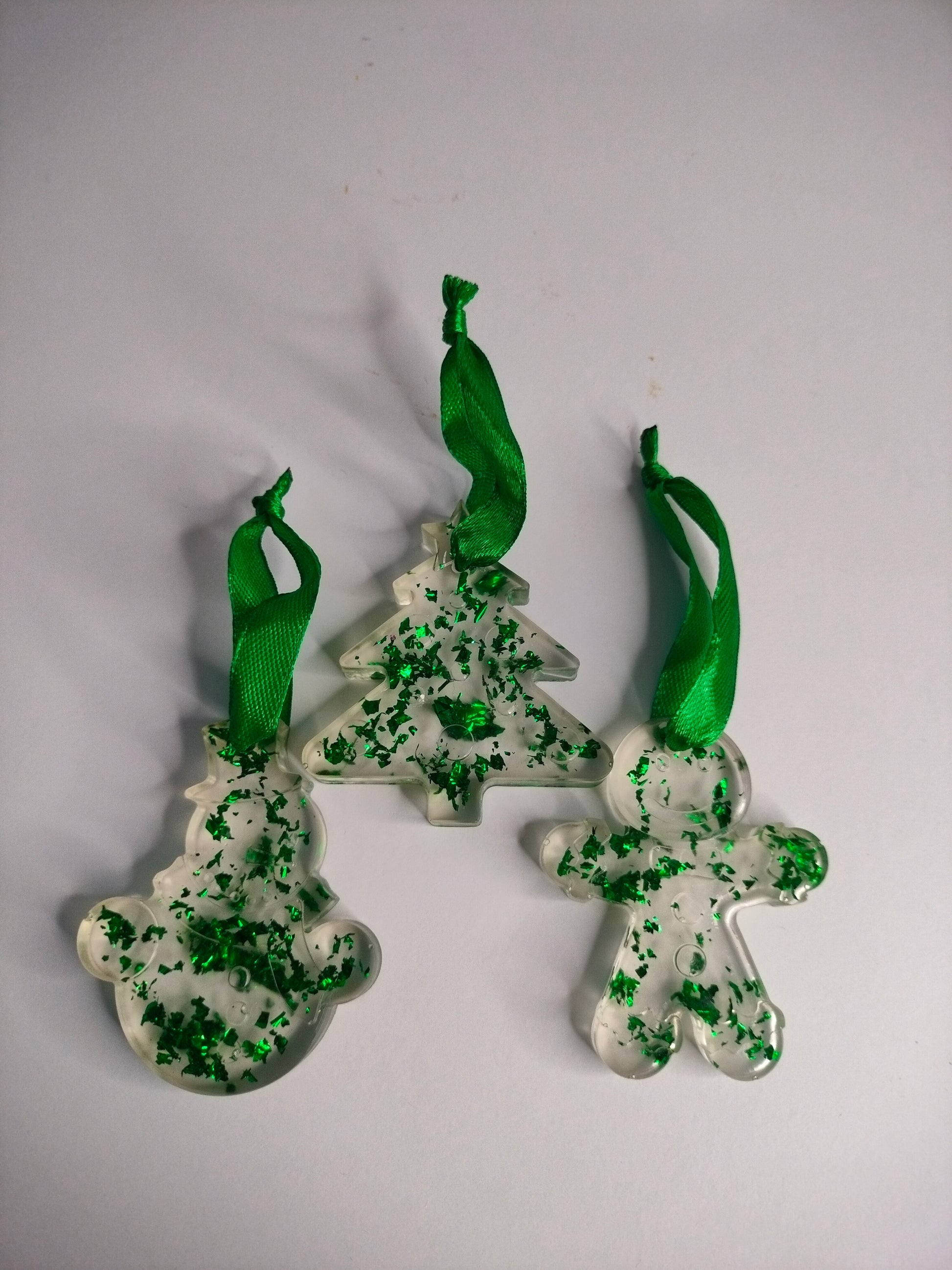Lot de 3 suspensions de noël vert transparent comprenant : 1 sapin , 1 bonhomme de neige et 1 monsieur pain d'épices