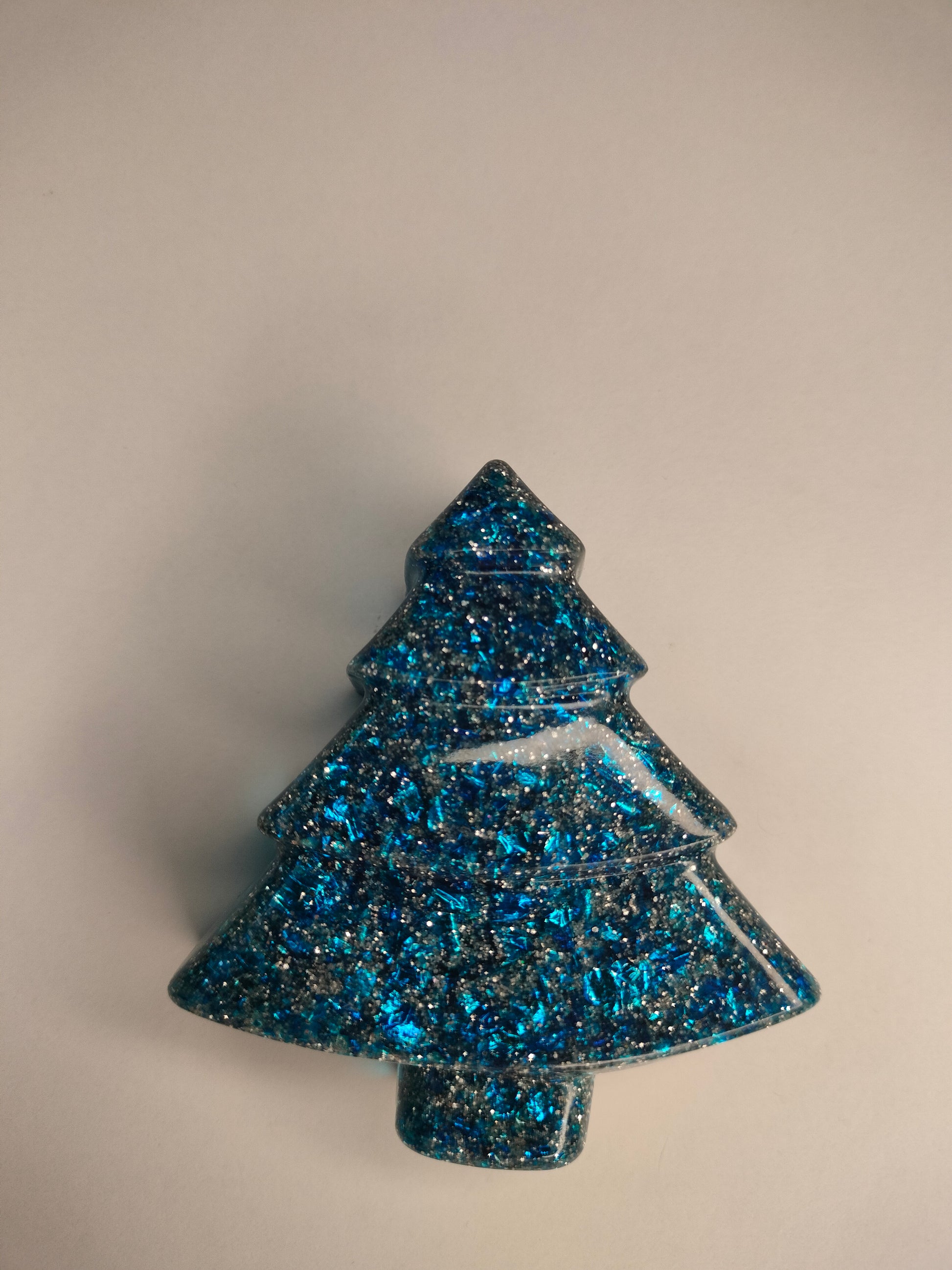 Magnet de noël en forme de sapin bleu et paillettes argenté.