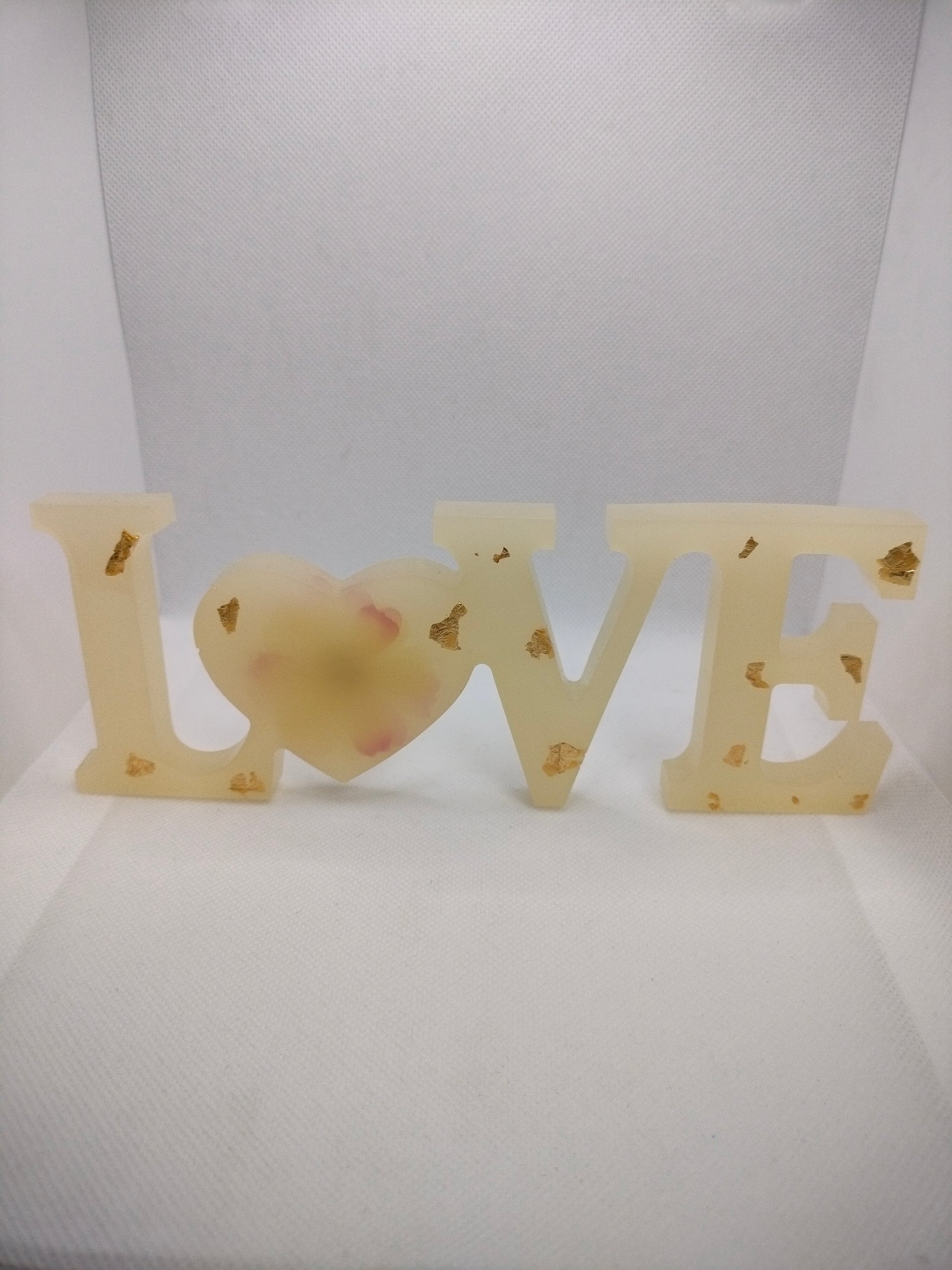 Mot décoratif love blanc transparent avec des feuilles or ainsi qu'une fleurs au centre du coeur.