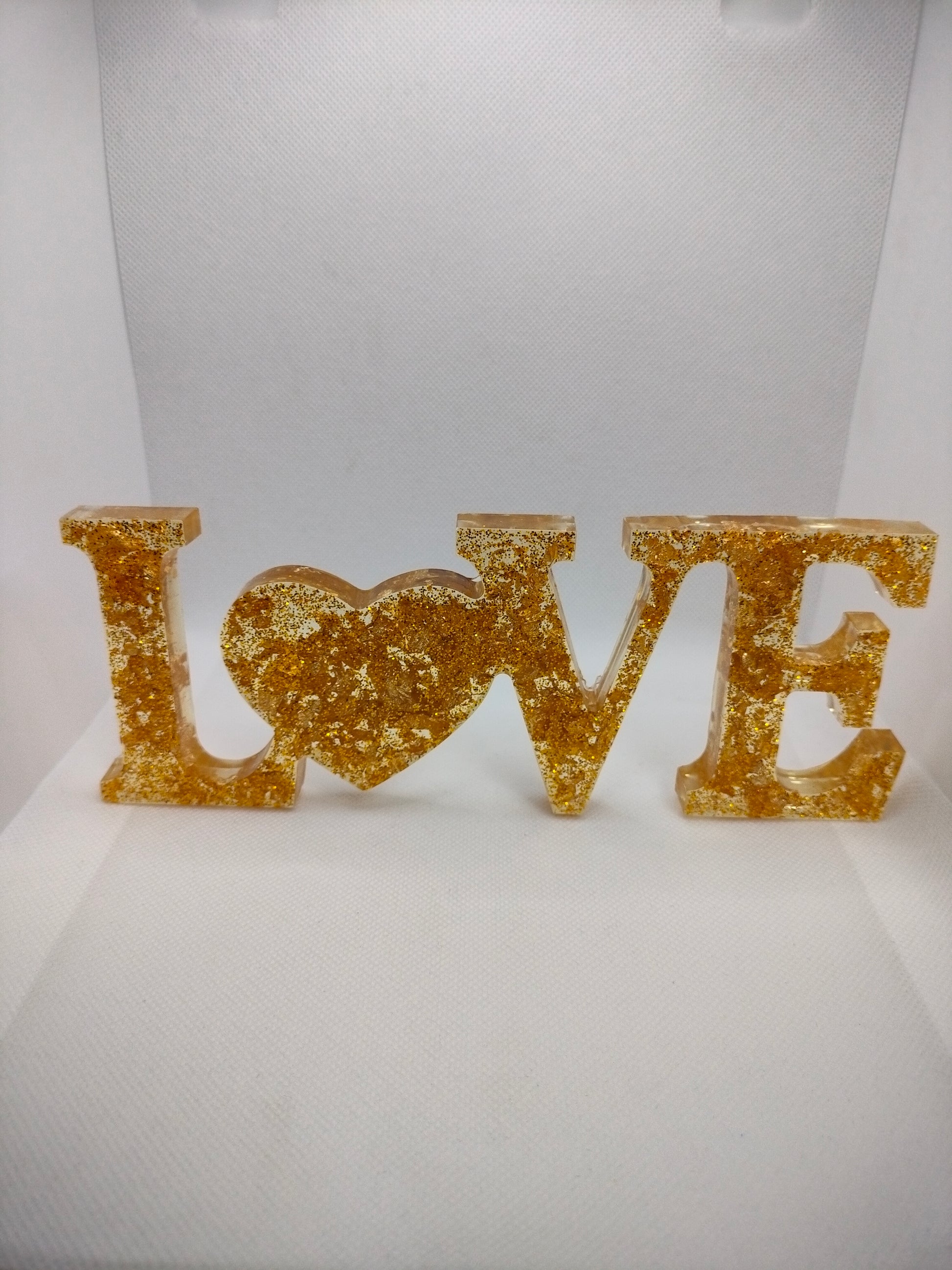 Mot décoratif Love transparent avec des feuilles et des paillettes or