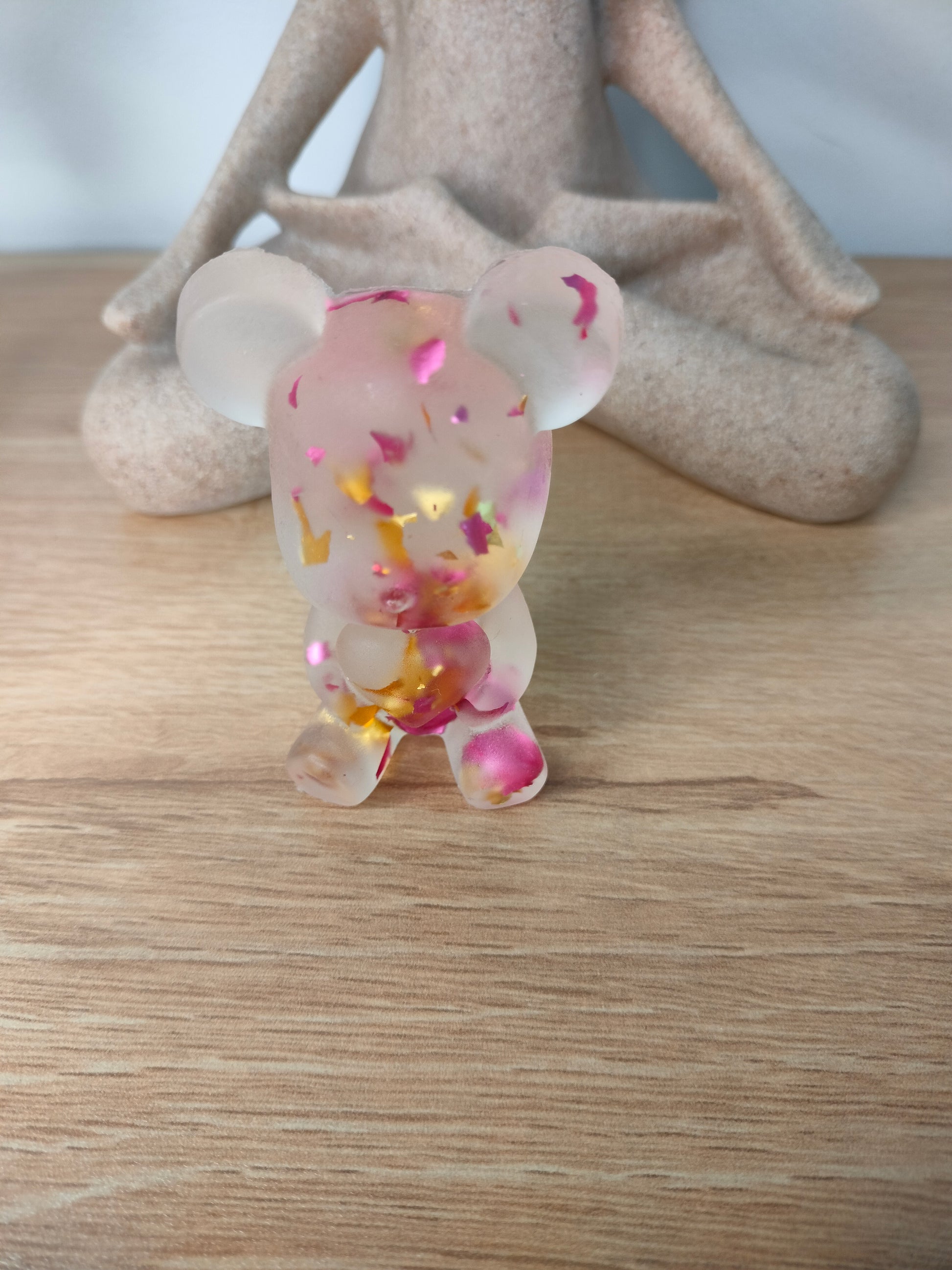 Figurine ourson coeur transparent avec des feuilles or et roses