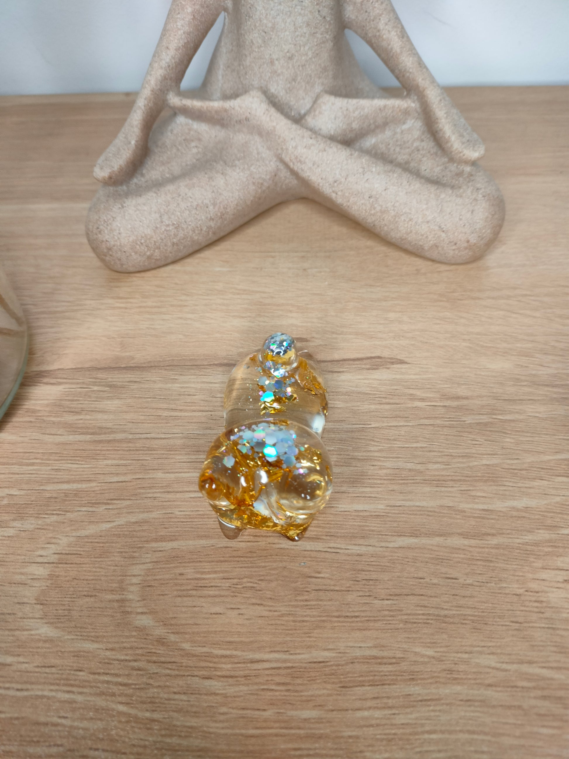 Petit chat transparent avec des feuilles or et des paillettes holographique