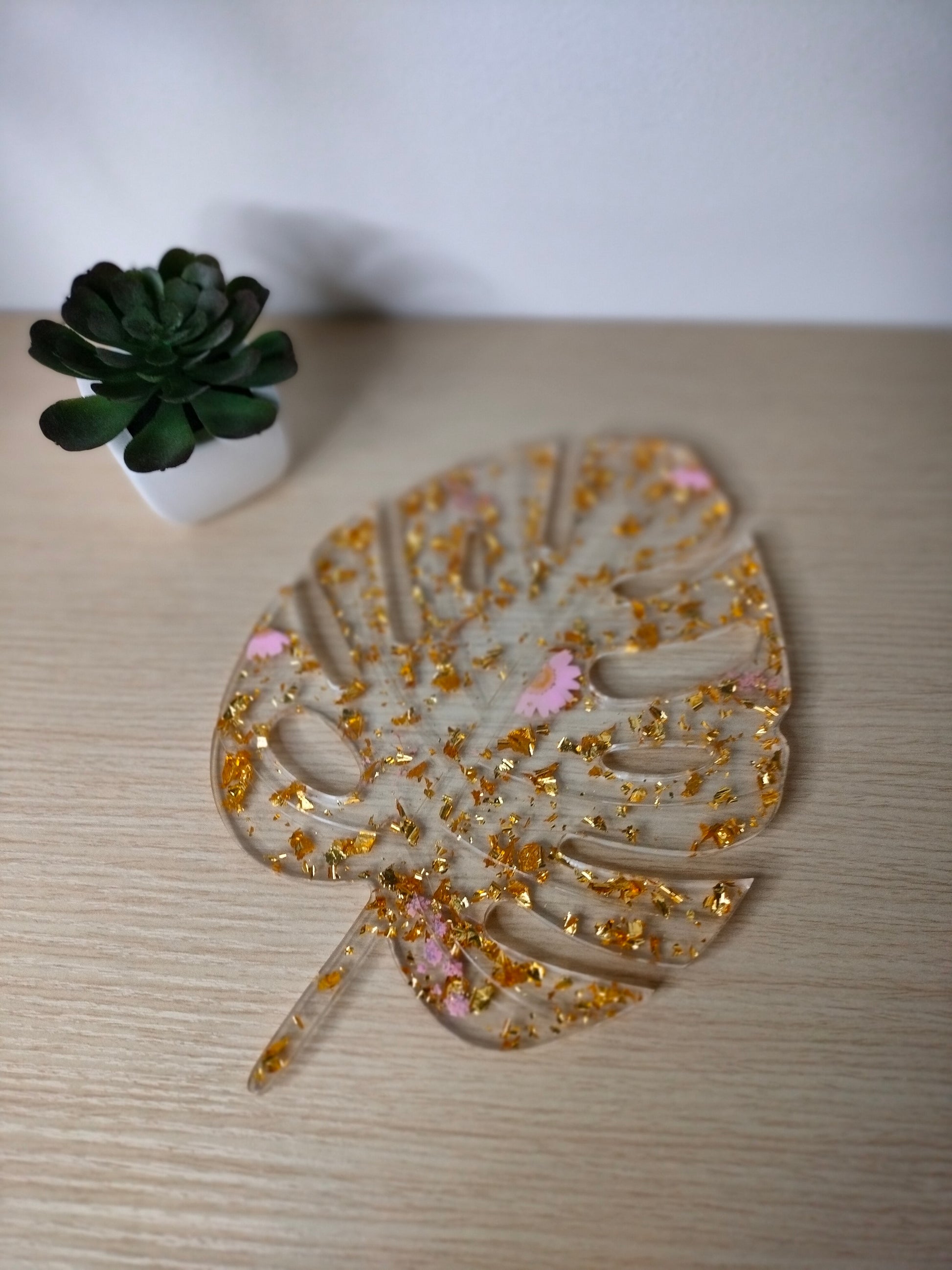 Plateau feuille de monstera transparent or avec des fleurs rose