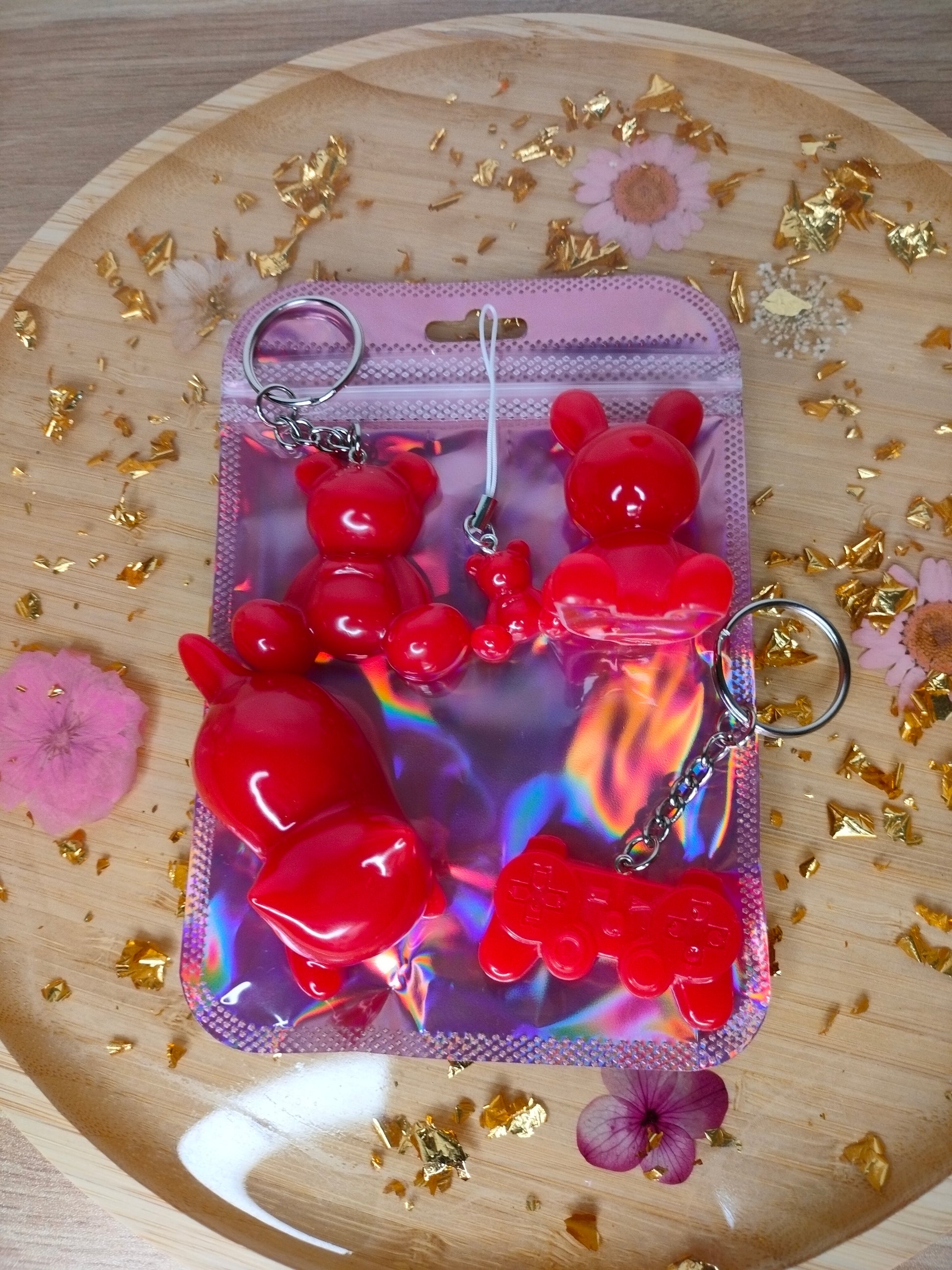 Pochette découverte rouge avec 5 articles dont 1 figurine lapin , 1 figurine chat , 1 porte-clé ourson , 1 porte-clé manette et 1 bijoux de téléphone ourson