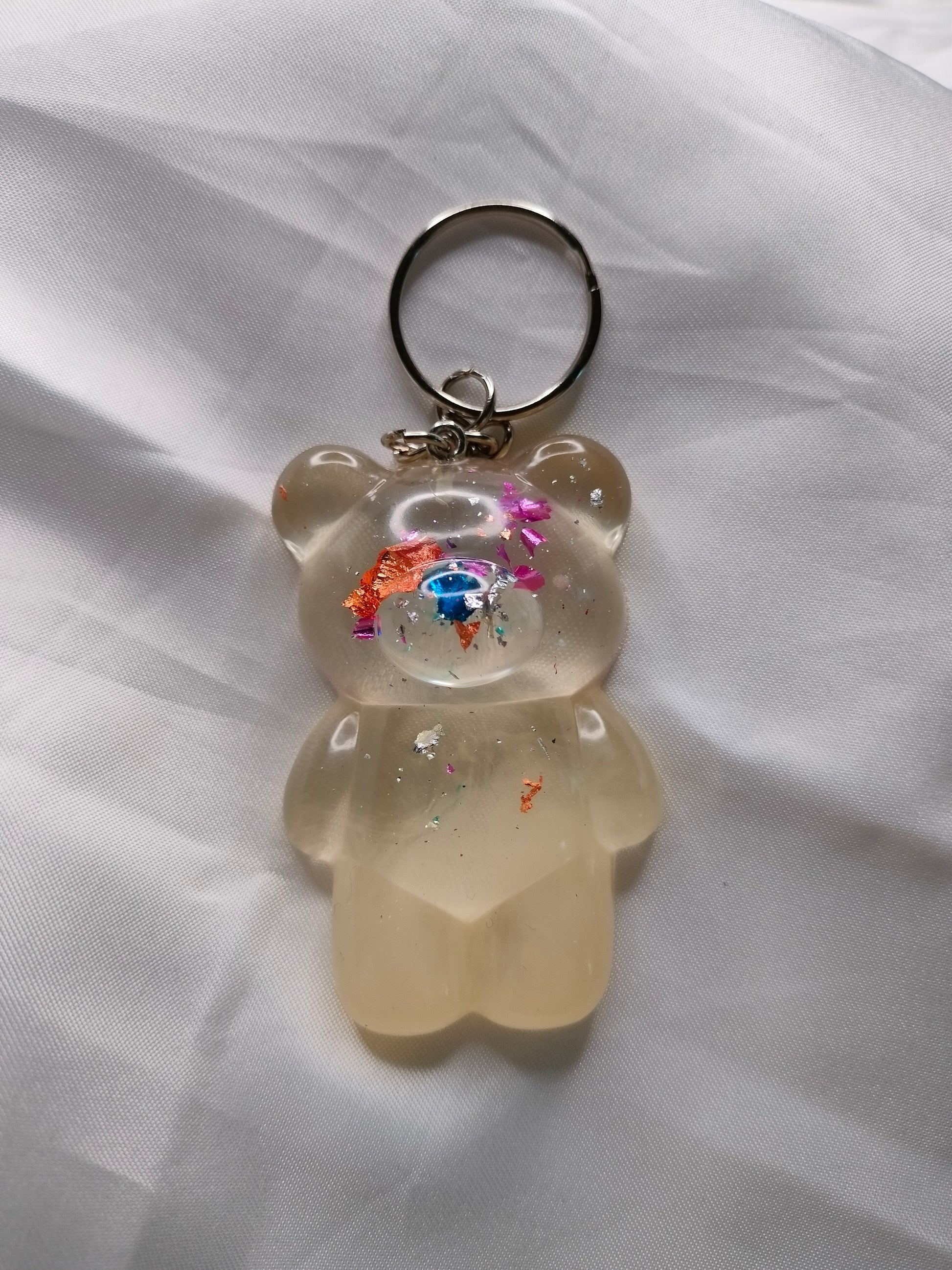 Porte-clé grand ourson blanc , transparent avec des feuilles de couleurs