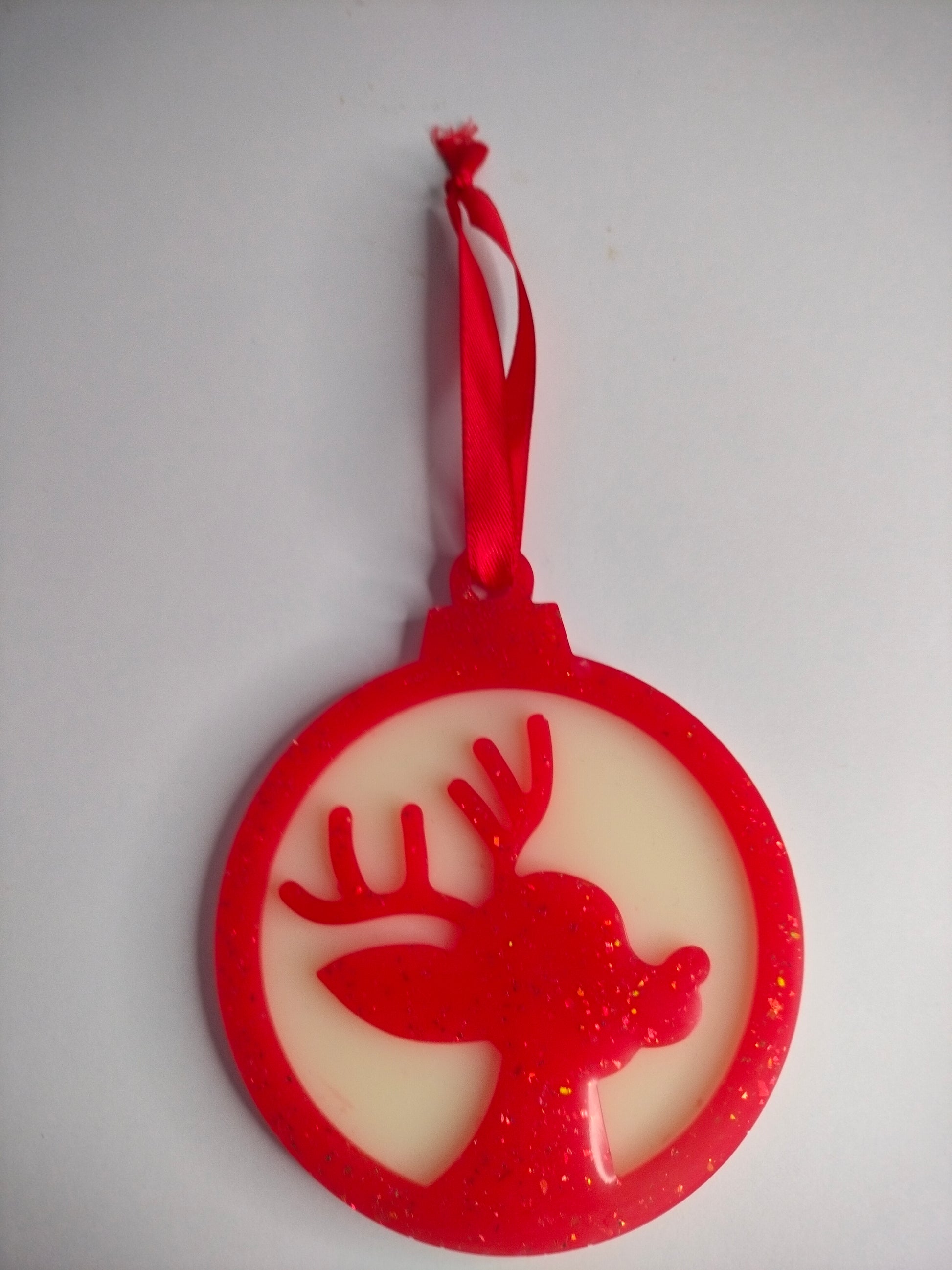 Grande suspension de noël en forme de boule avec un renne au centre blanc et rouge holographique.