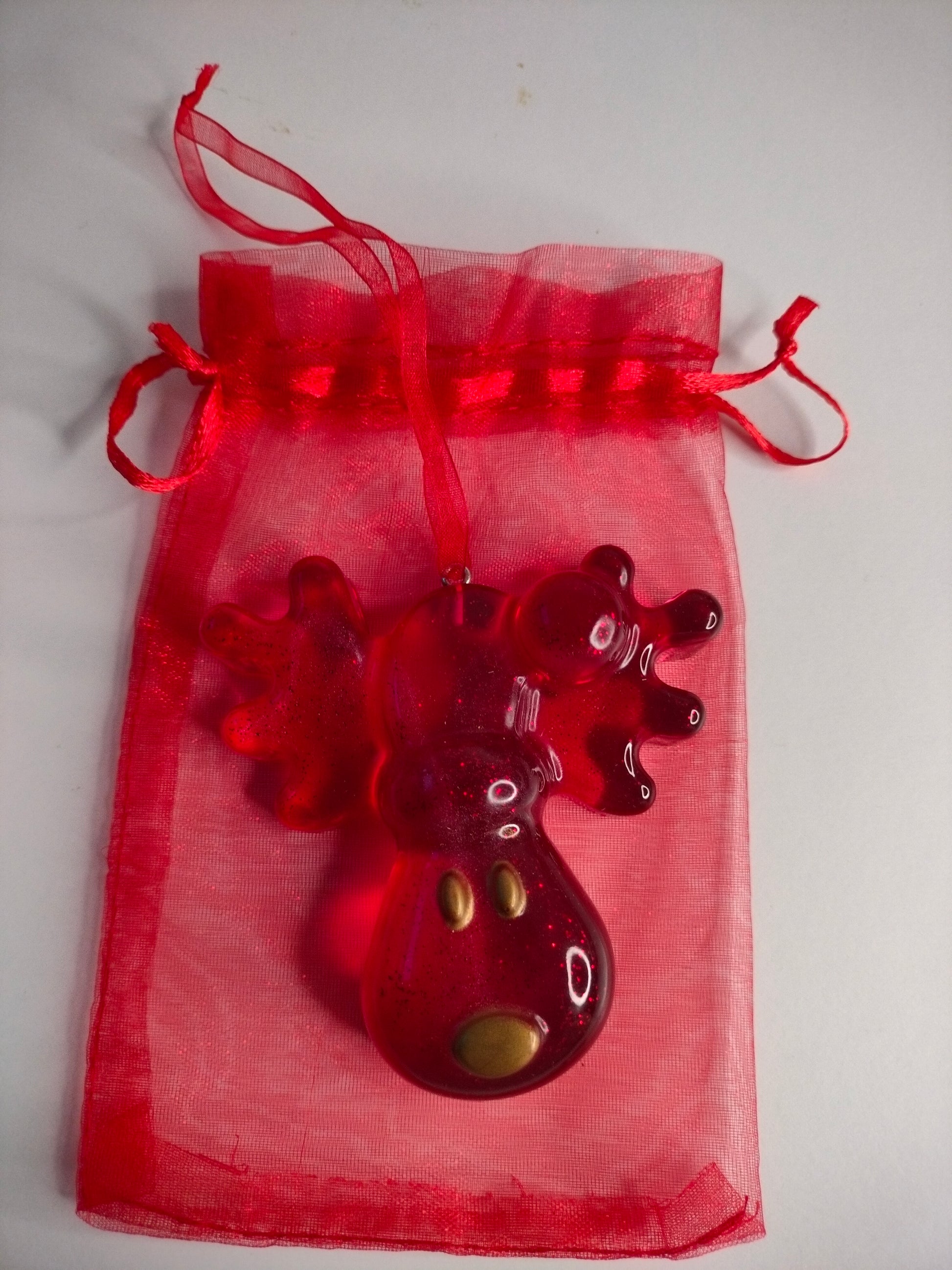 Grande suspension de noël en forme de renne rouge et or.