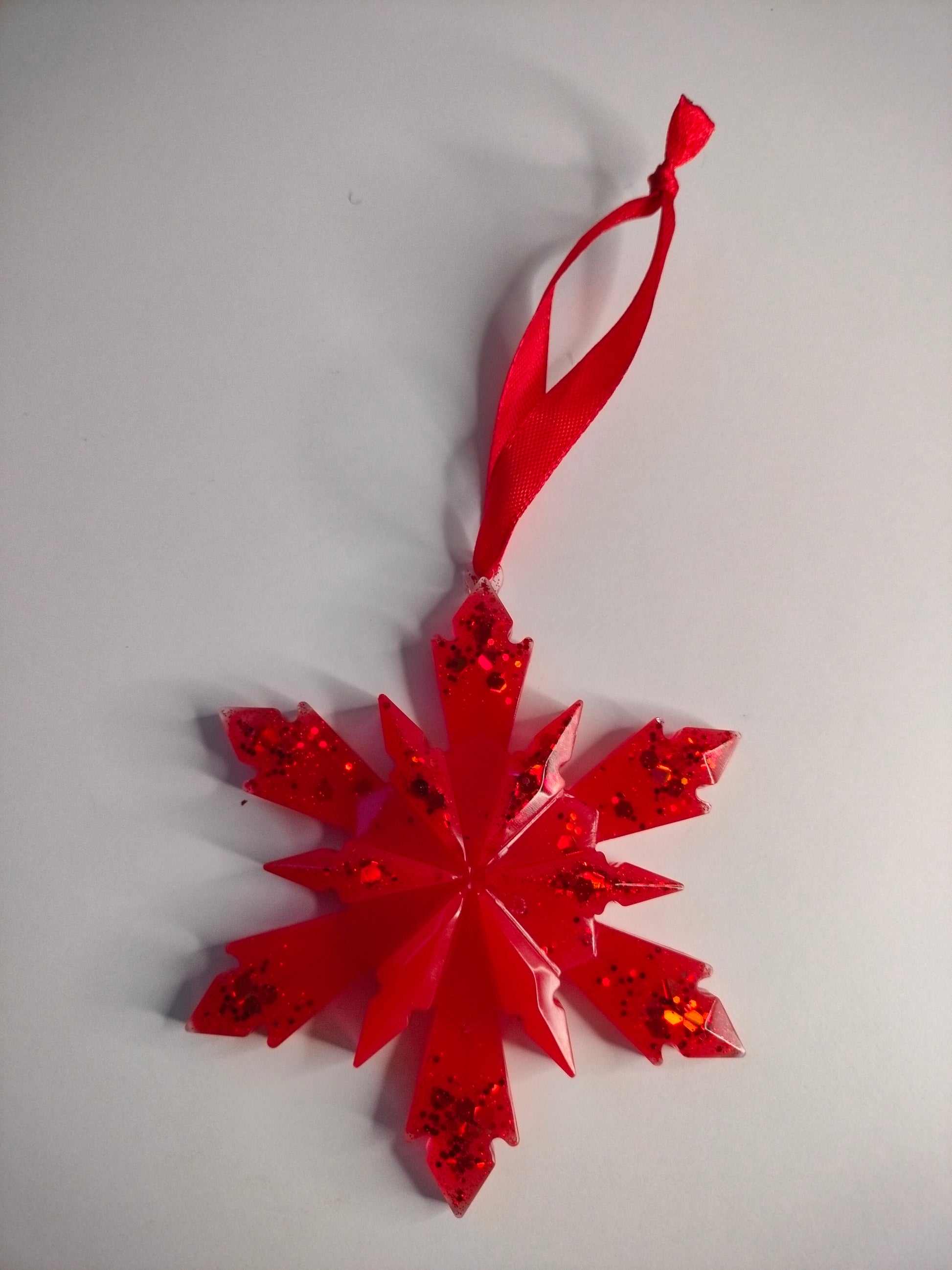 Grande suspension de noël en forme de flocon de neige rouge pailleté.