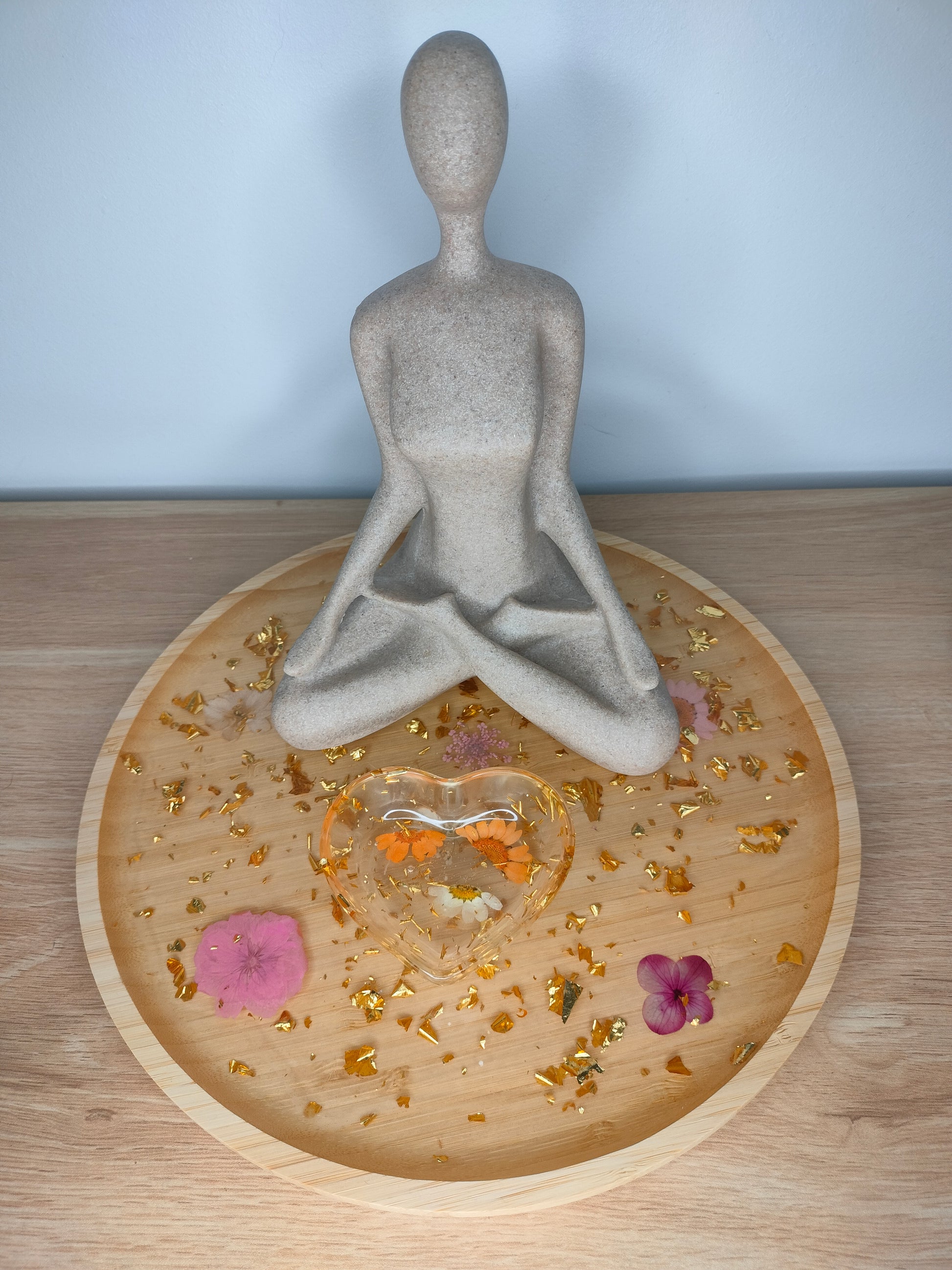 Vide-poches mini coeur transparent avec des feuilles d'or et des fleurs blanche et orange