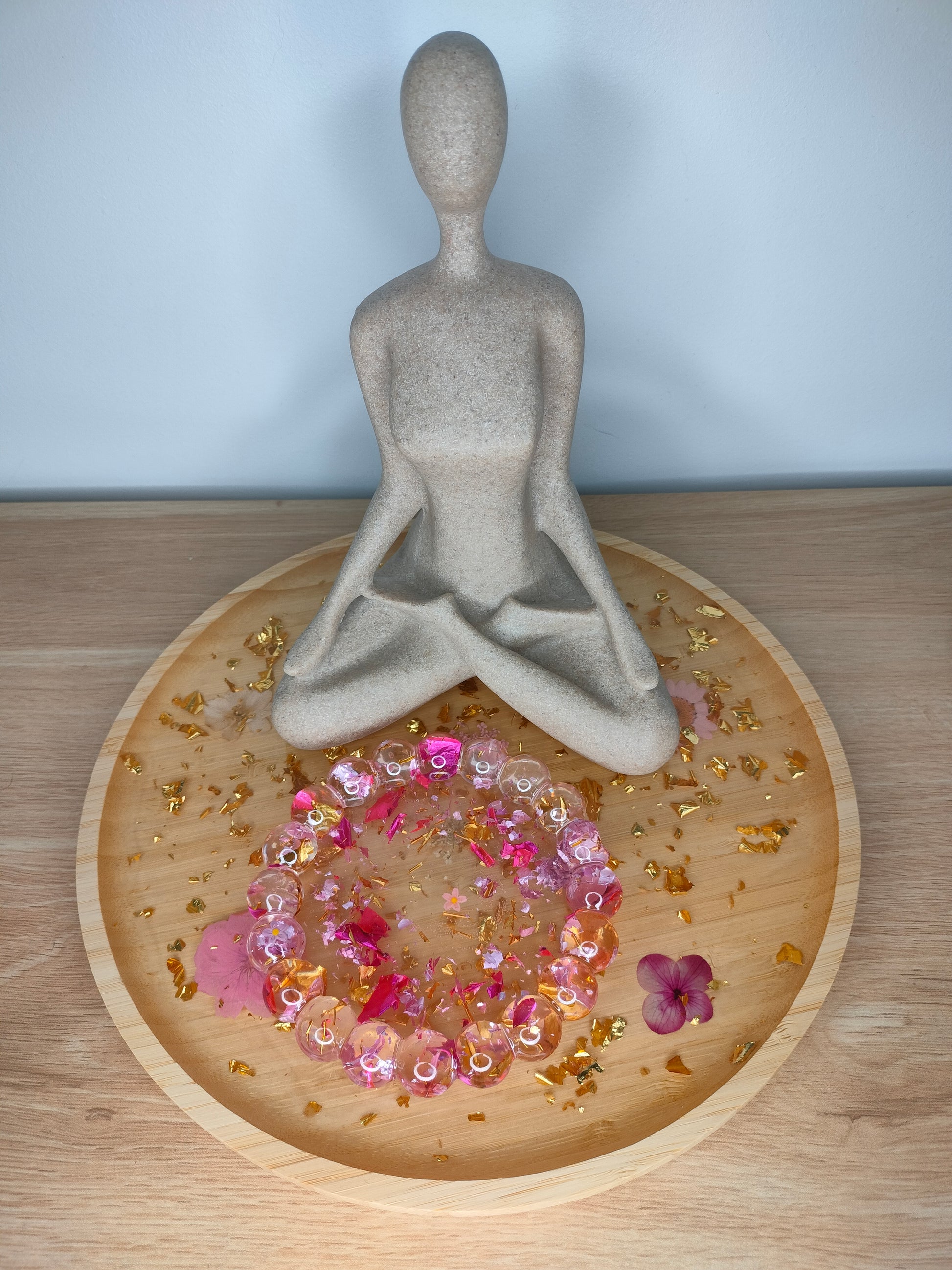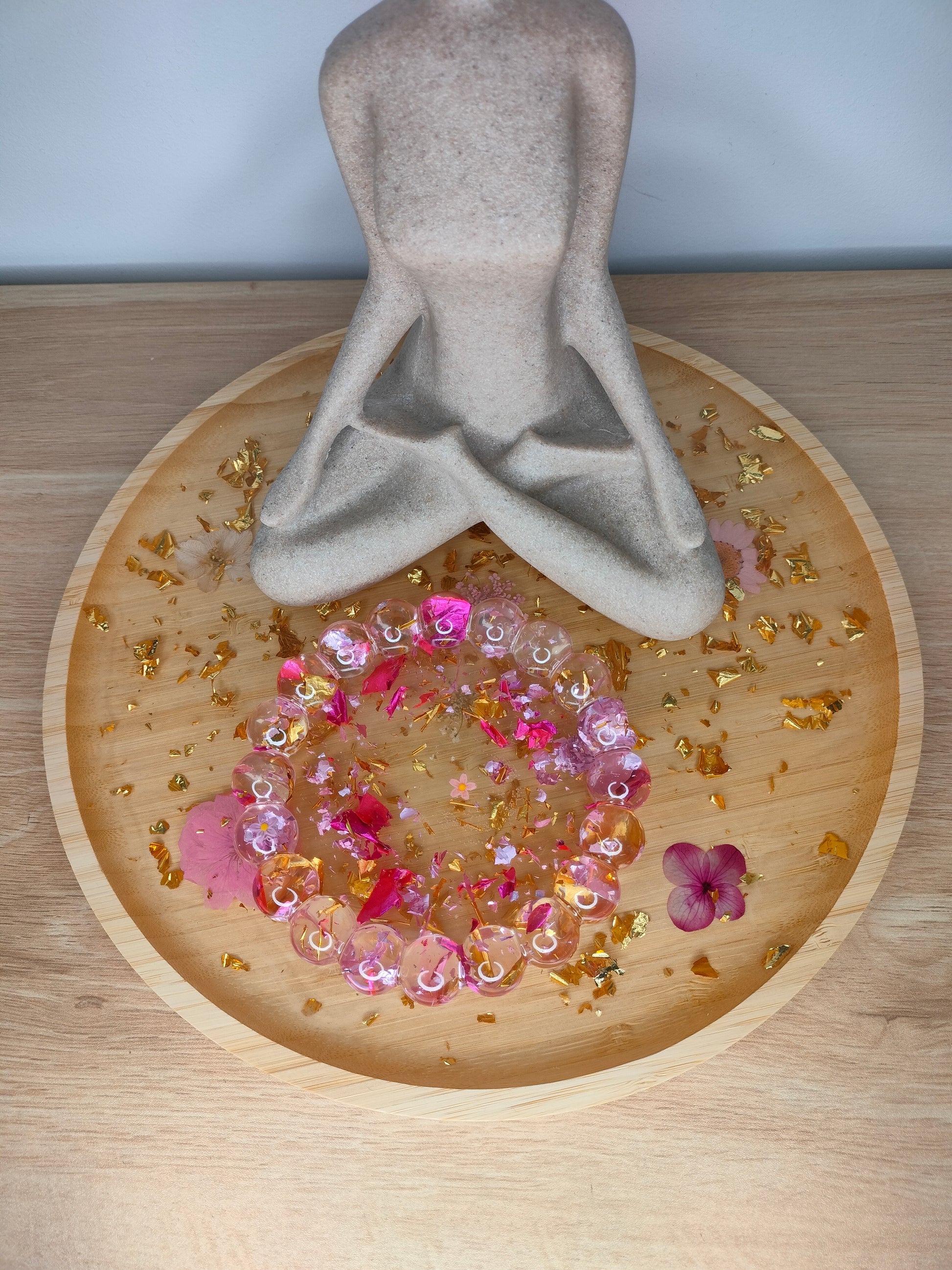 Vide-poches bubulles transparent avec des feuilles d'or rose et violine ainsi que des fleurs de couleurs